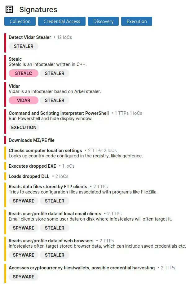 El malware utilizado en esta ocasión se llama Vidar, un infostealer con varios años de antigüedad que se deriva de un malware previo conocido como Arkei. Esto evidencia que el mundo del malware está en constante cambio y que los delincuentes son capaces de adaptarse a las demandas de sus clientes cibercriminales, evolucionando para hacer que su uso sea más sencillo y, al mismo tiempo, efectivo.